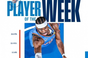 亚历山大上周率领雷霆取得4胜0负的战绩,场均拿下28.8分4.5篮板6.5助攻。