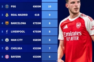 俱乐部全球身价前100球员数量排行:阿森纳、巴黎各10人并列榜首