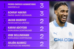 本赛季欧冠助攻榜:奥巴梅扬和阿什拉夫均3次,分列前二